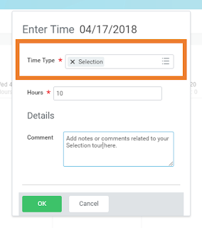 3. When the time entry form appears, change the TIME TYPE from "Hours" to "SELECTION," and enter the number of hours you worked on this particular task. See below for more information on each field: