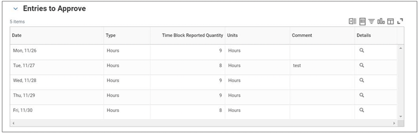 The time sheet window will open on the right, allowing you to view the hours worked, and/or any time off requests. Under the “Details” column, click on the magnifying glass icon to see detailed information about each time entry block. This is where you will see meal breaks for CA and NV employees.